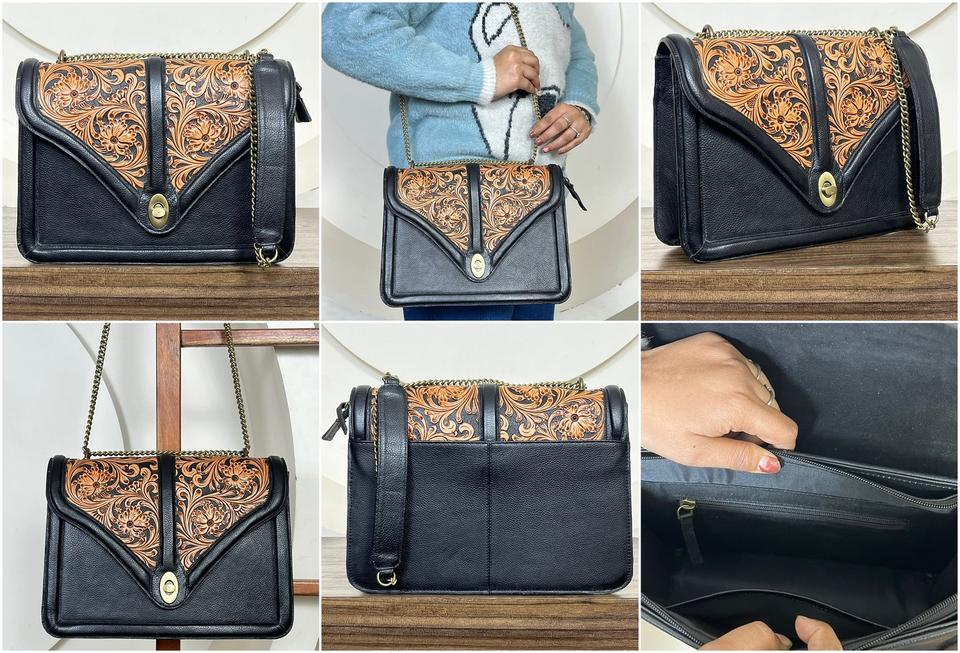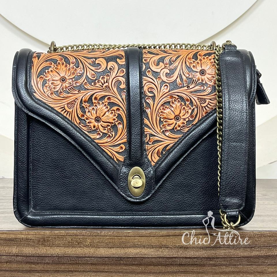 2025 Latest Elegant Hand Tooled Cowhide Leather Shoulder Bag with Floral Design Turn-Lock Stylish Women's Crossbody Sling Purse