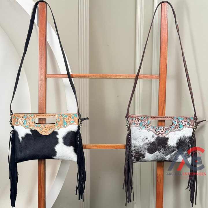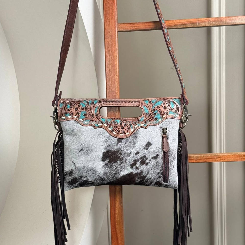 Hand Tooled Cowhide Leather Fringe Crossbody Bag