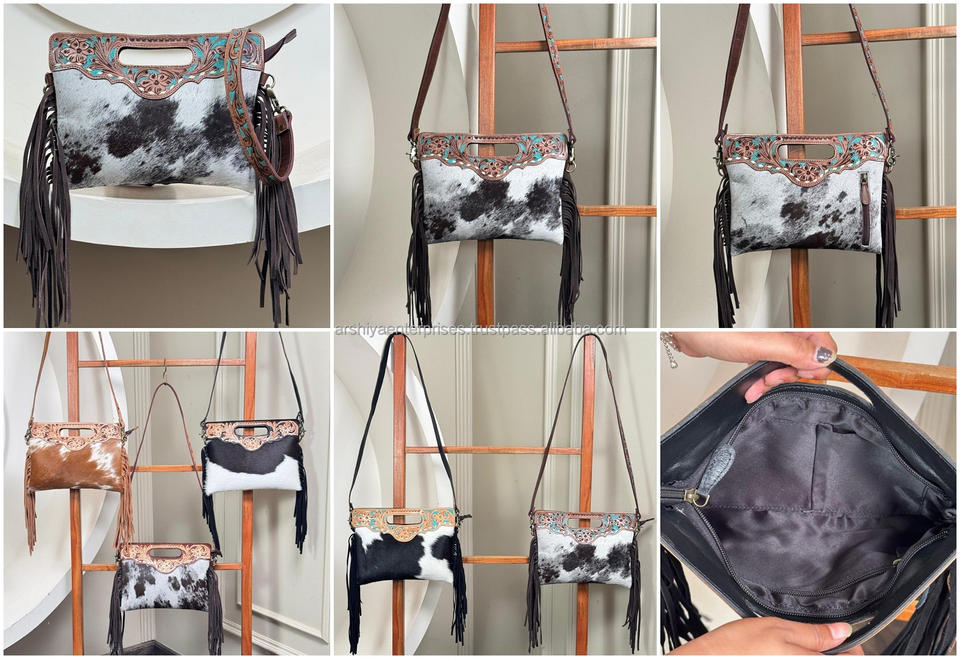 2025 Latest Fashion Women's Bags Customized Hand Tooled Cowhide Leather Handbags Handled Zipper Crossbody Shoulder Fringe Bags