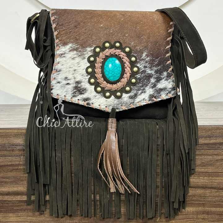 2025 Latest Hot Selling Women's Luxury Quality Top Material Cowhide Suede Leather Crossbody Fringe Handbag Turquoise Stone Purse