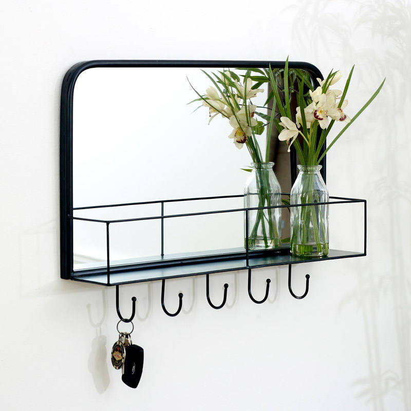 2025 Latest Style Modern Luxury Arched Black Frame Wall Hanging Mirror with Shelf and Hooks for Home Decor