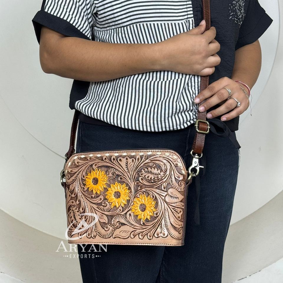 Product Name:Hand Tooled Genuine Leather Sunflower Crossbody Bag