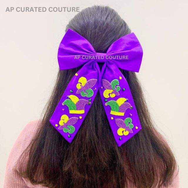 2025 Mardi Gras Collection Indian Handmade Beaded Hair Clip Trendy Style with Alligator Look Tail Bow Soothing Fabric Material