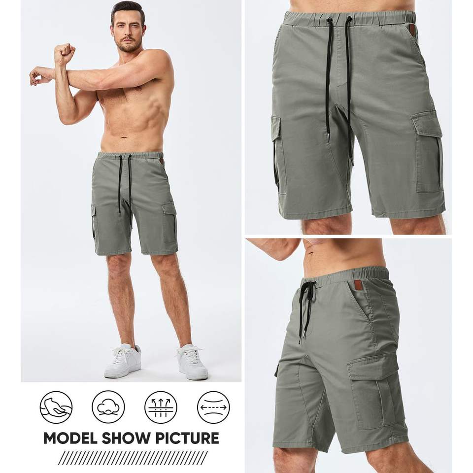 2025 Men's Casual Cargo Shorts Cotton Drawstring Stretch Twill Chino 6 Pockets Summer Beach Style Woven 2XL Size Logo