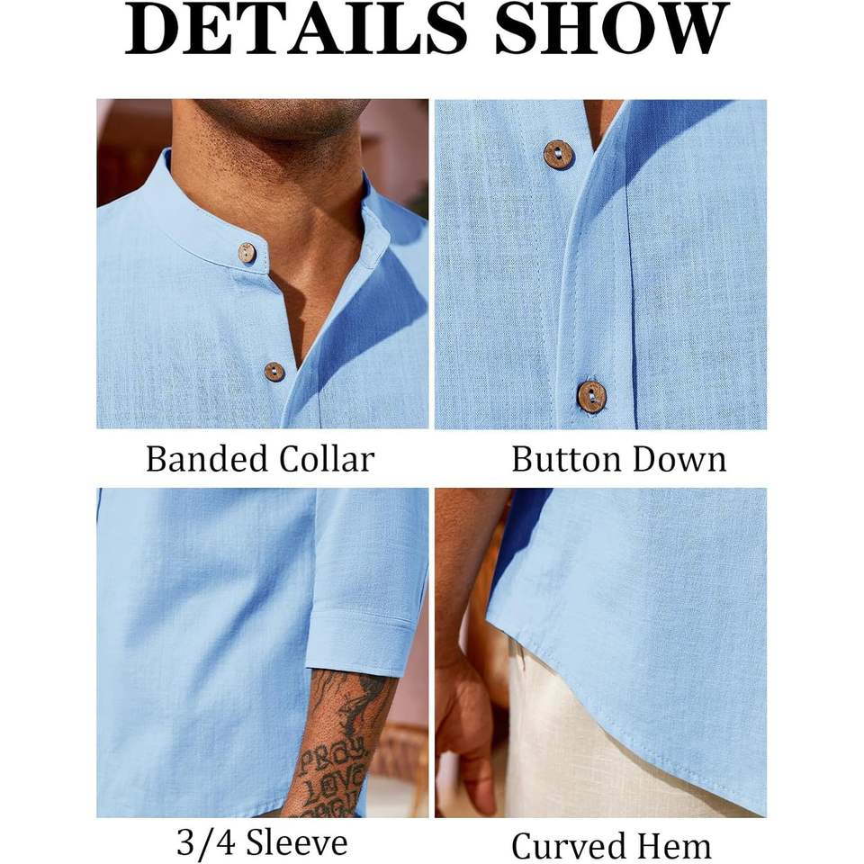 2025 Men's Casual Linen Shirt 100% Cotton 3/4 Sleeve Button Down Banded Collar Summer Beach Style Size 6XL