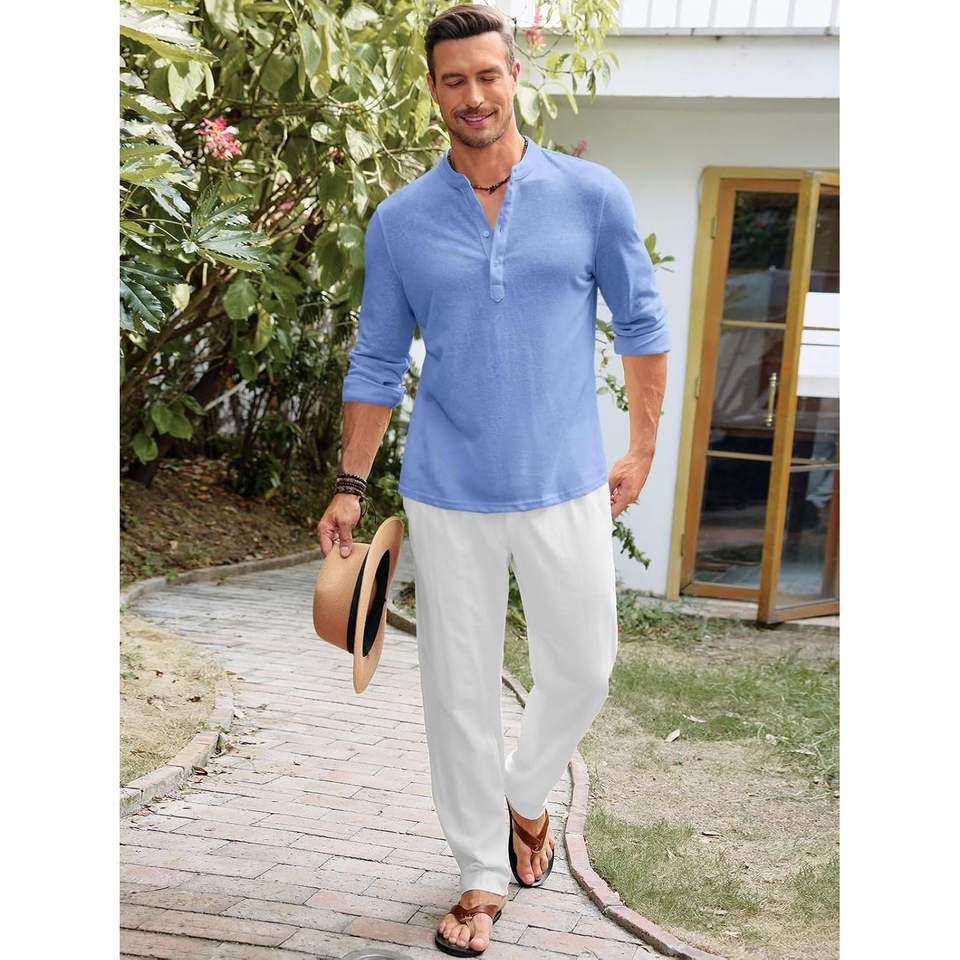 2025 Men's Casual Summer Beach Tops Long Sleeve Henley Shirt Roll up Cotton Hippie Design