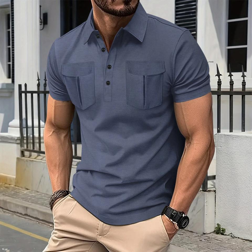 2025 Men's Comfortable 100% Cotton for POLO Shirts New Solid Color Short Sleeve Casual Style Front Button Lapel Double Pocket