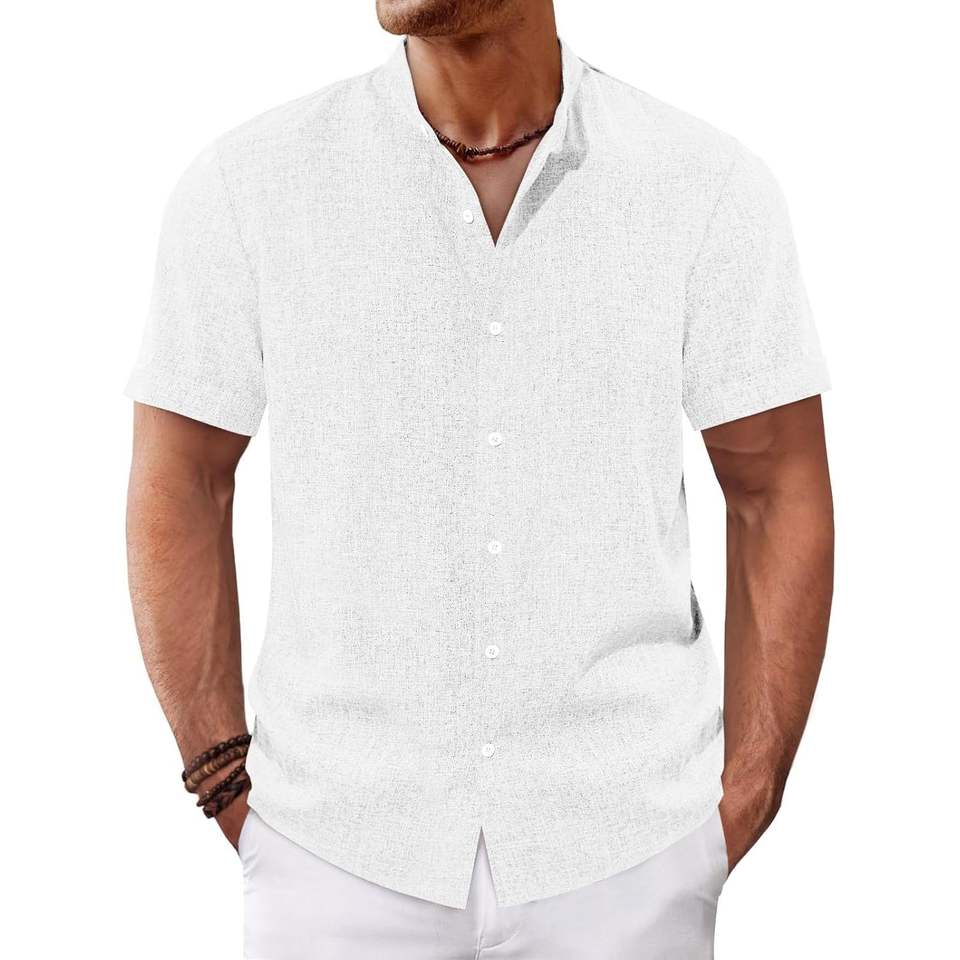 2025 Men's Floral Short Sleeve Casual Button Down Shirt Banded Collar Linen Tops for Summer Beach ODM Supply