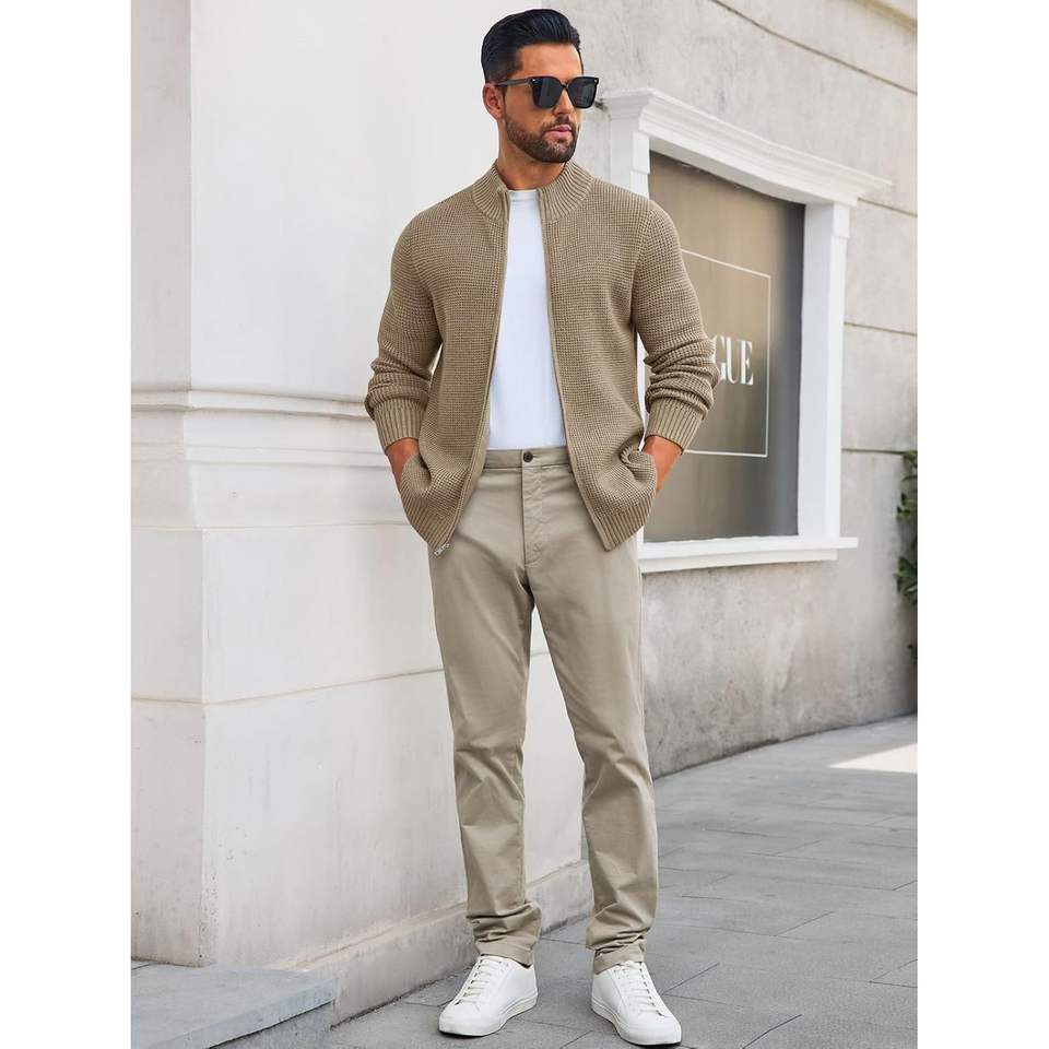 2025 Men's Full Zip Cardigan Sweater Casual Waffle Stand Collar Knitted Winter Chunky Sweater Vintage Pattern Autumn Spring