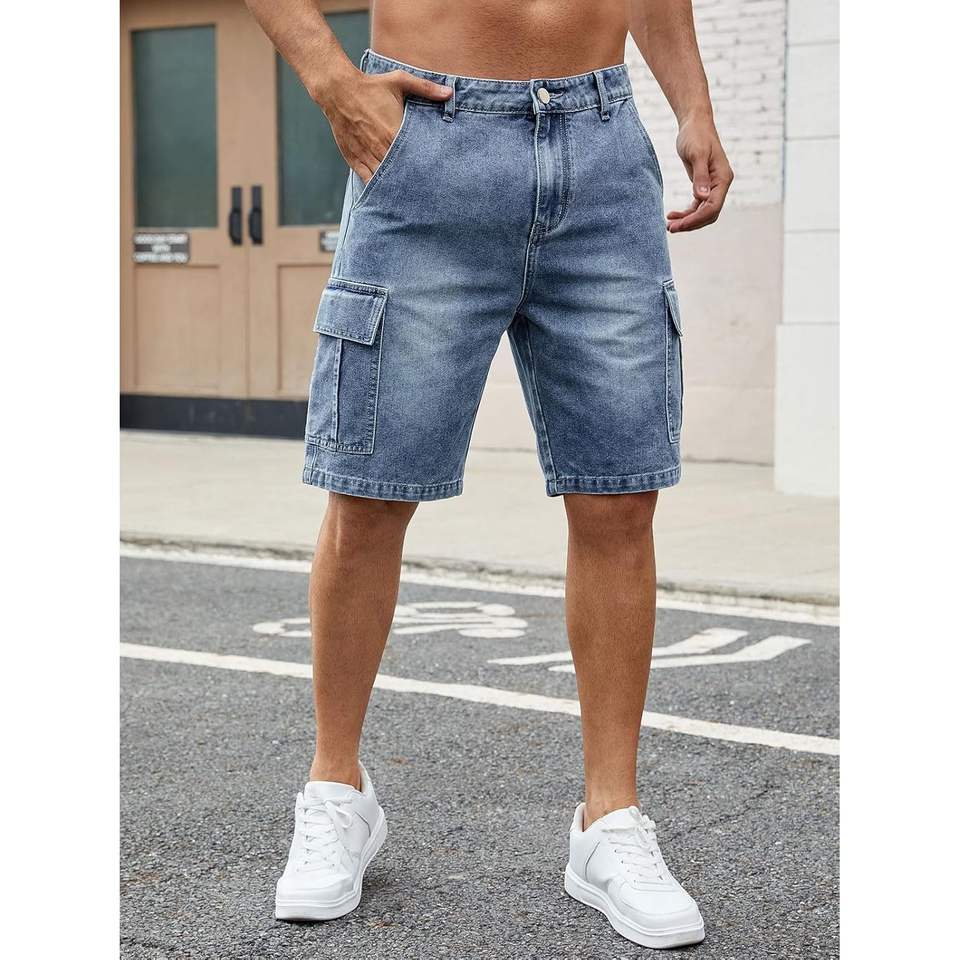 2025 Men's High Waist Vintage Style Denim Cargo Shorts Loose Fit Multi-Pockets Embroidered Animal Print Patterns Light