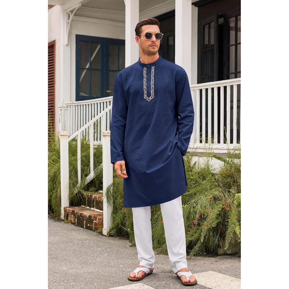 2025 Men's Kaftan Shirts Button-Down Casual Henley Long Sleeve Robe Cotton Linen Muslim Gown Button-Down Style