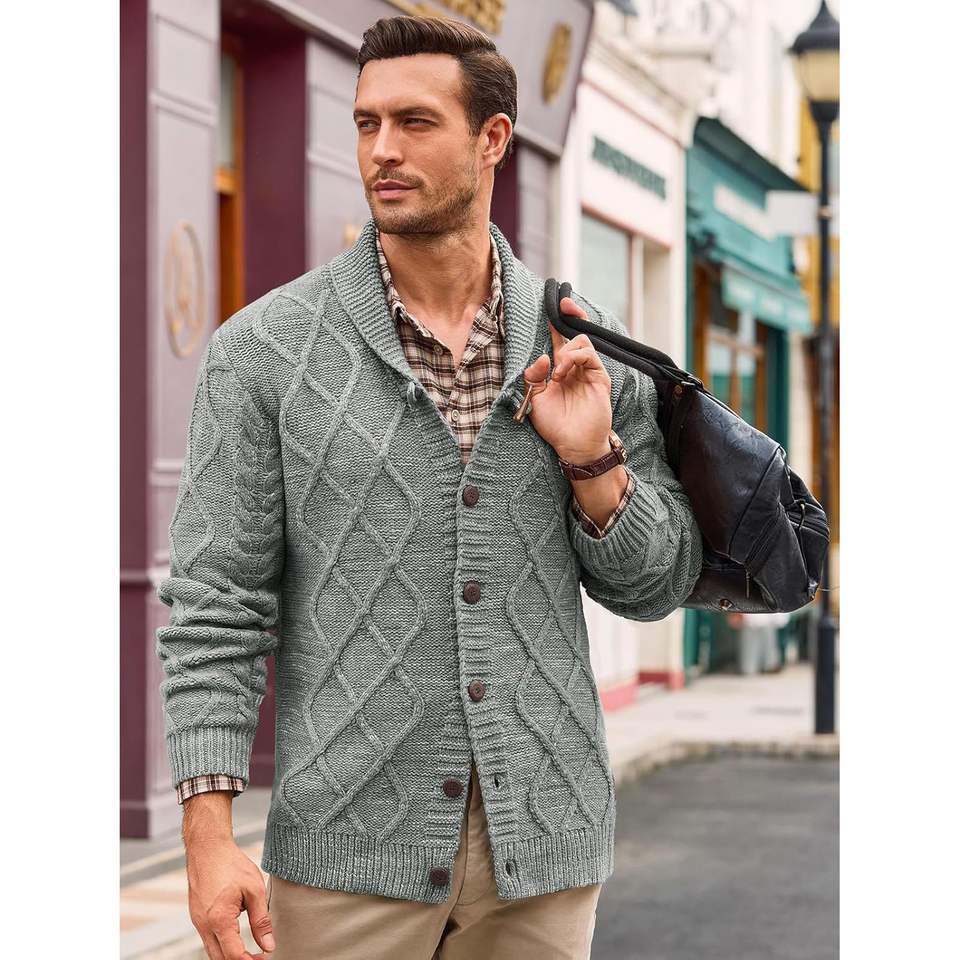 2025 Men's Plaid Cable Knit Cardigan Sweater with Shawl Collar Casual Button Down Twisted Design for Fall Winter ODM Supply