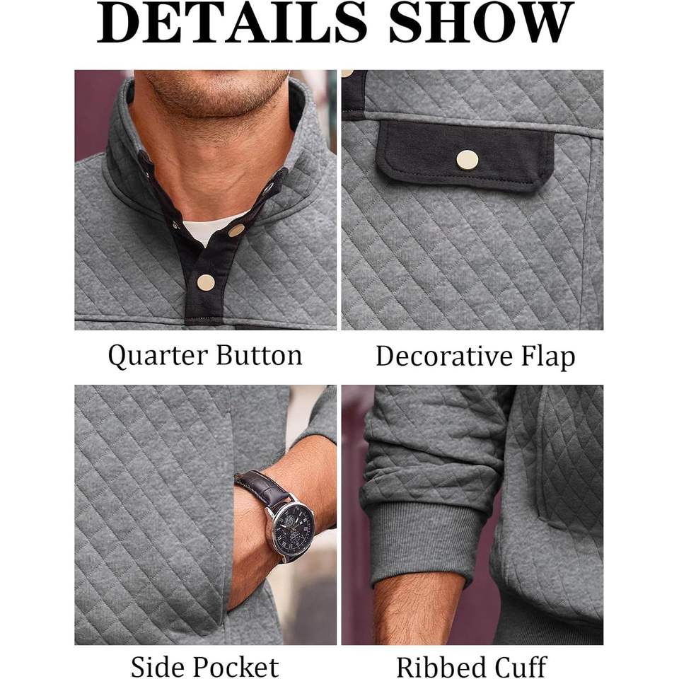 2025 Men's Quilted Sweatshirt with Stand Collar Casual Diamond Pullover Long Sleeve Quarter Button Custom Label Sizes XXS 2XL