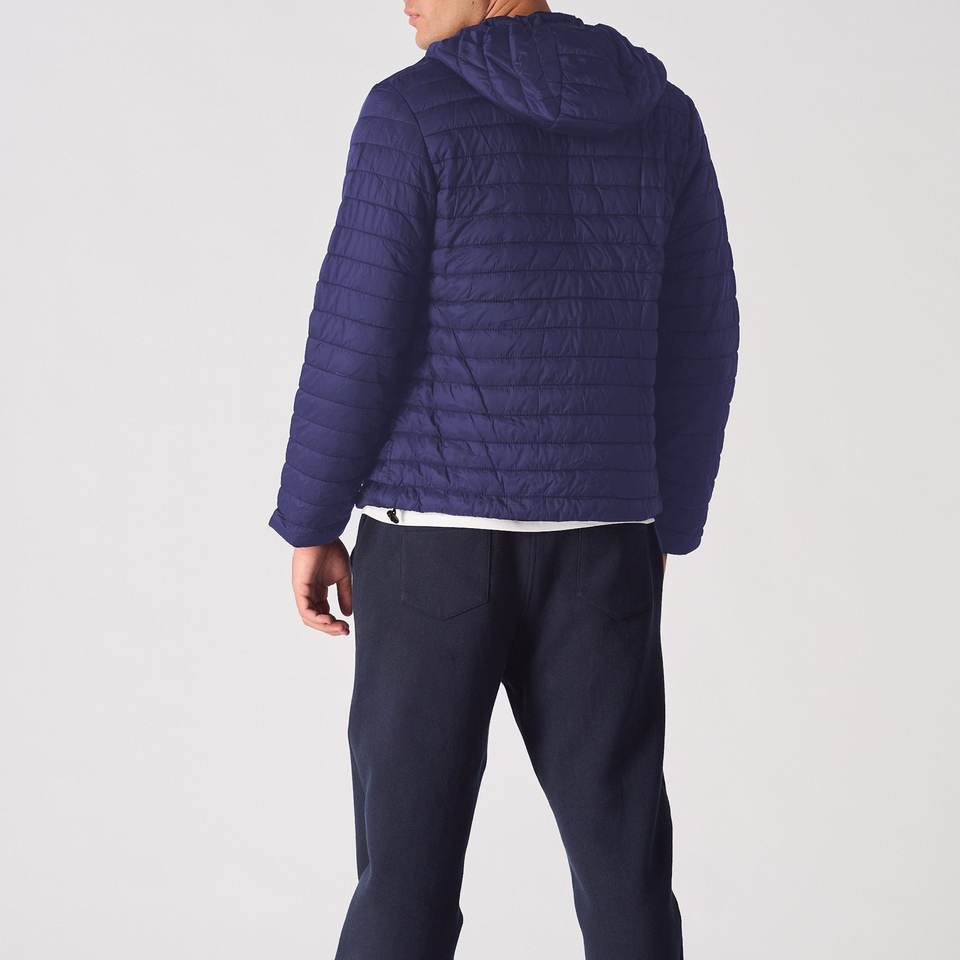 2025 Men's Unique High Street Design Blue Puffer Jacket Hooded Long Coat with Thin Coating Front Logo High Quality Winter Wear