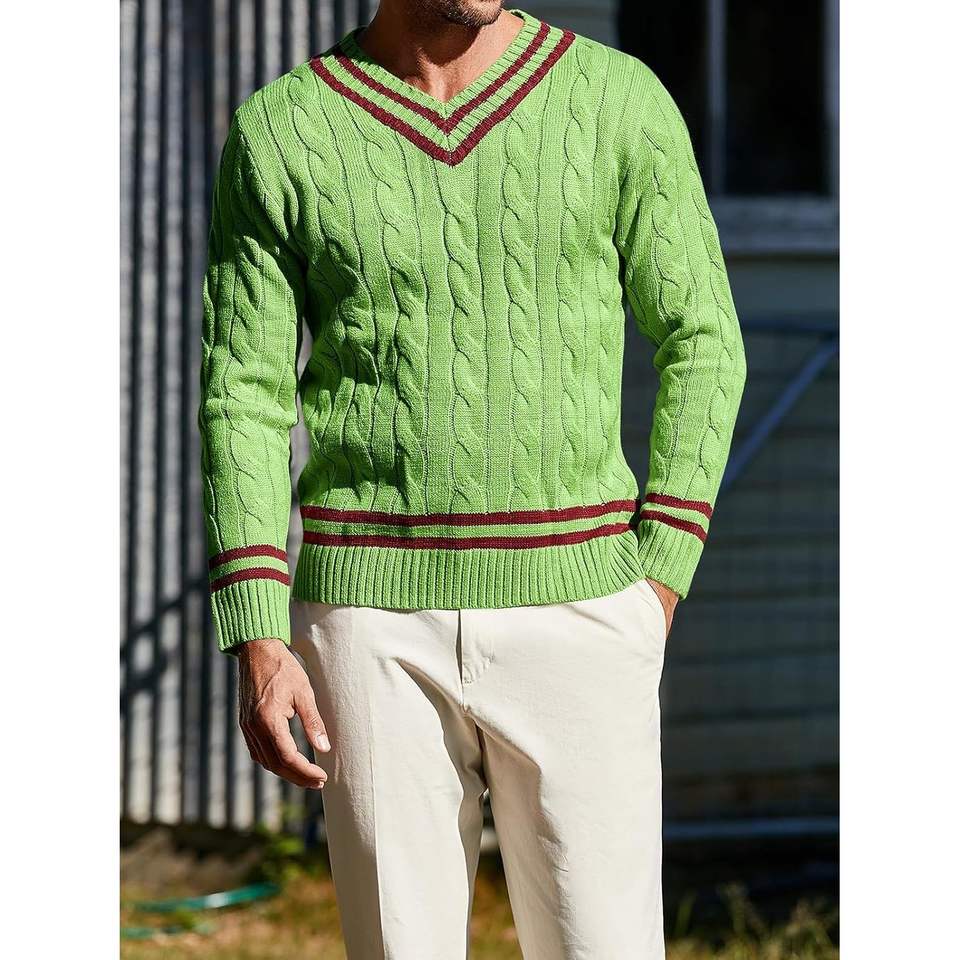 2025 Men's V Neck Cable Knit Sweater Chunky Relaxed Fit Thermal Pullover Fashion Twist Design for Tennis for Outdoor Sports