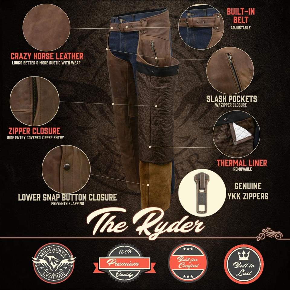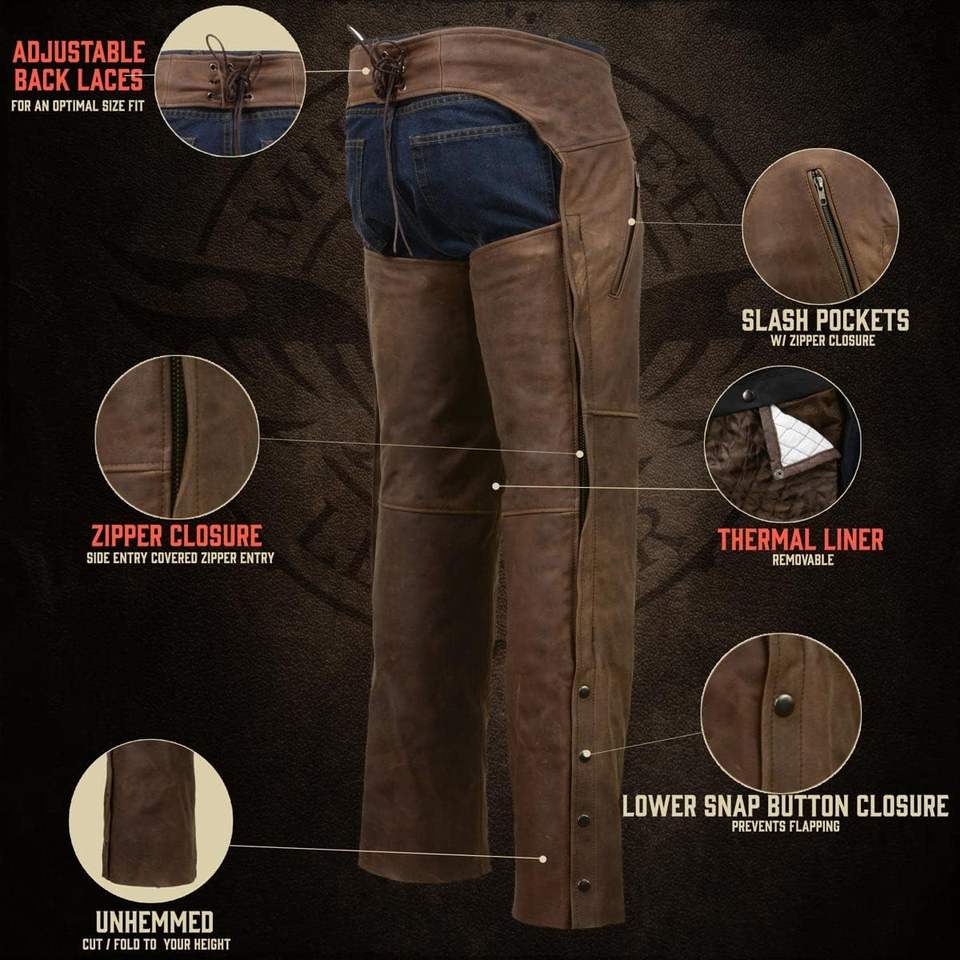 2025 Men's Vintage Crazy Horse Brown Leather Chaps Snap Out Thermal Lined Motorcycle Chap Auto Racing Wear MLM5518