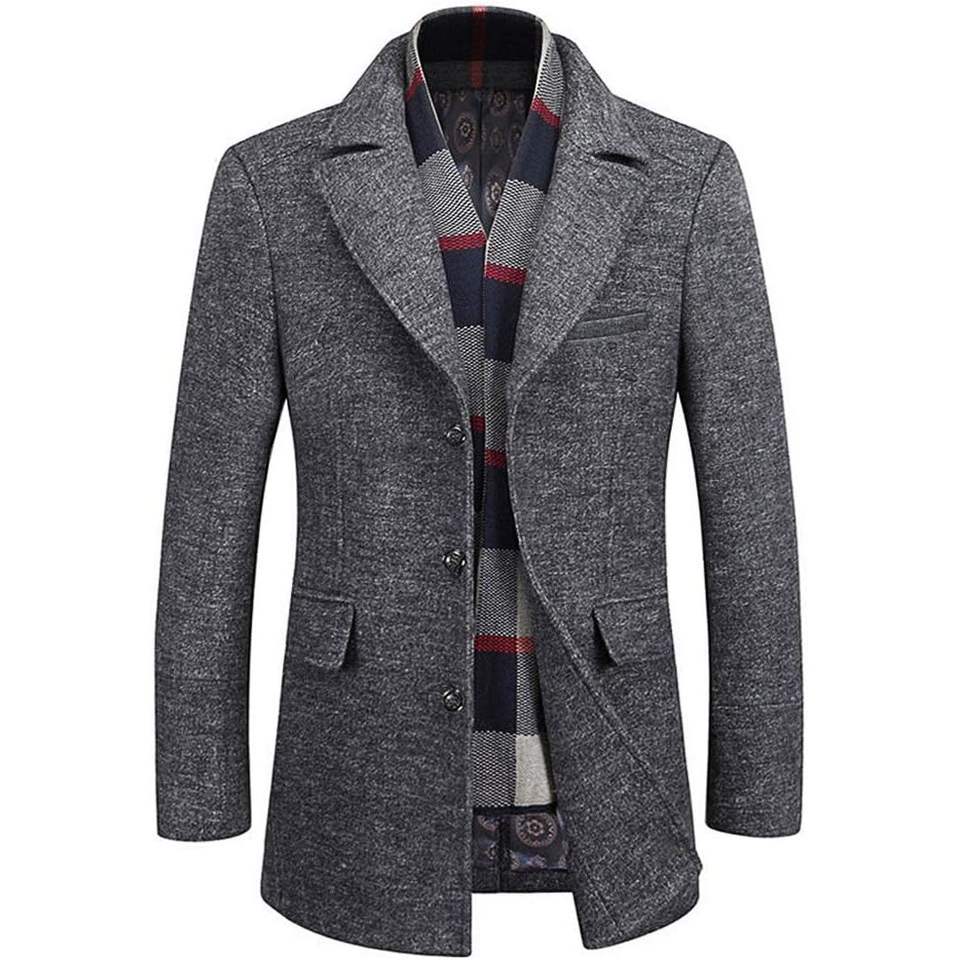 2025 Men's Wool Blend Winter Coat Slim Fit Short Trenchcoat Detachable Soft Scarf Long Overcoat for Business Warm