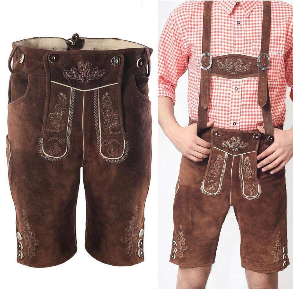 2025 Customized Men's Red Bavarian Lederhosen Lightweight Suede Leather Mid Flat Matching Suspenders Shorts (Trachten