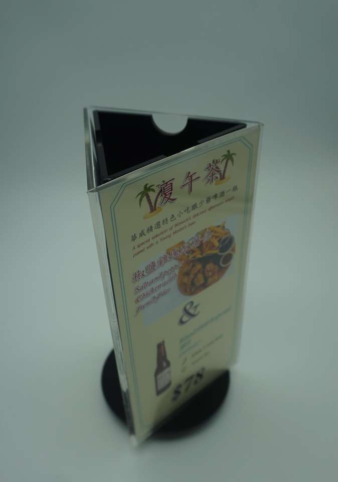 2025 Modern Stylish Rotatable Desktop Clear Acrylic Triangle Table Stand for 3-Sided Menu Holder & Eye-Catching Sign Display
