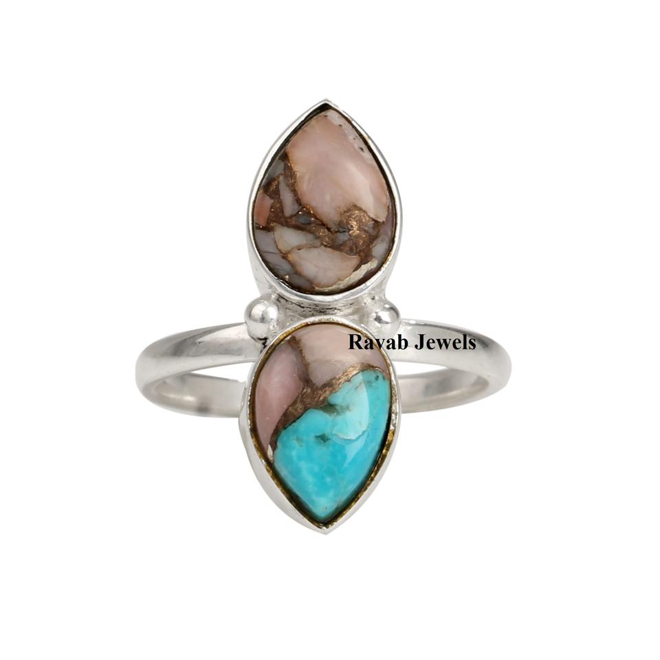2025 Natural Pink Opal Copper Turquoise Vermeil Double Pear 10x14mm Gemstone Eternity Ring Handmade Jewelry Wholesale Gift
