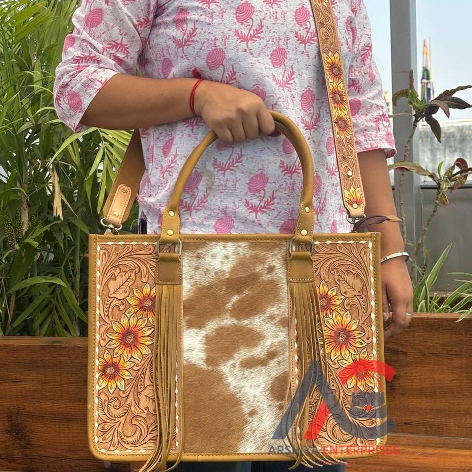 Hand Tooled Sunflower Cowhide Fringe Tote Bag