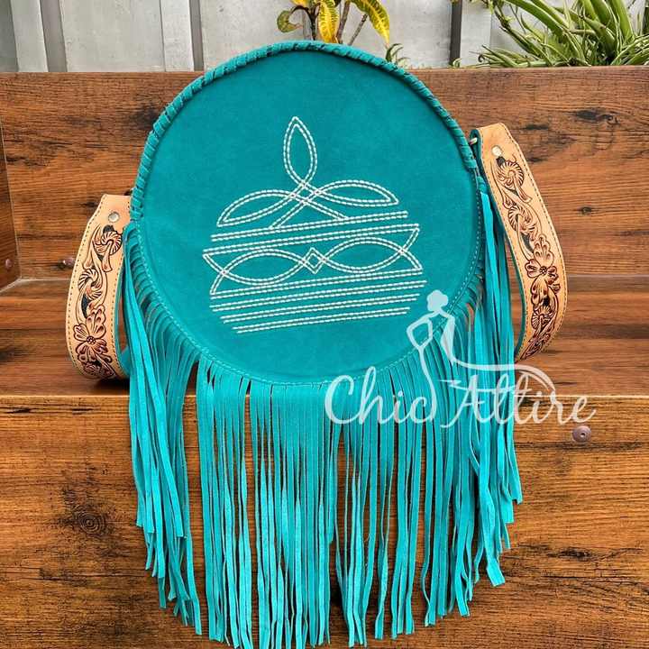 Product name:Hand Tooled Suede Leather Round Fringe Bag
