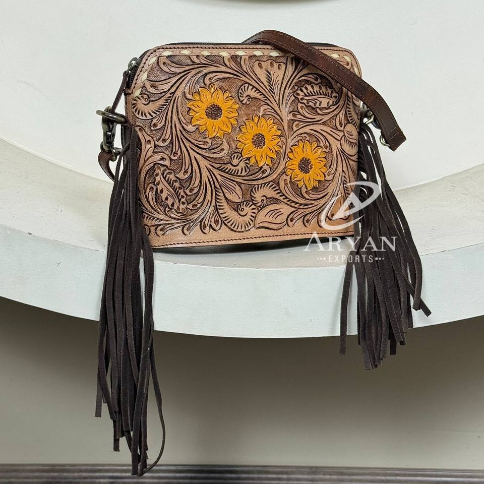 Product Name:Hand Tooled Leather Sunflower Crossbody Fringe Bag