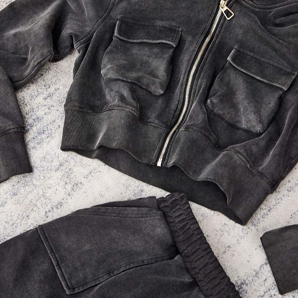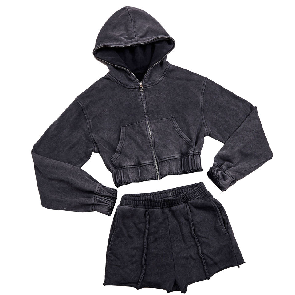 2025 New Arrivals Sexy Trendy Winter Women Acid Wash Long Top Hoodie Short Sets 100% Cotton Streetwear Two Piece Sale Price