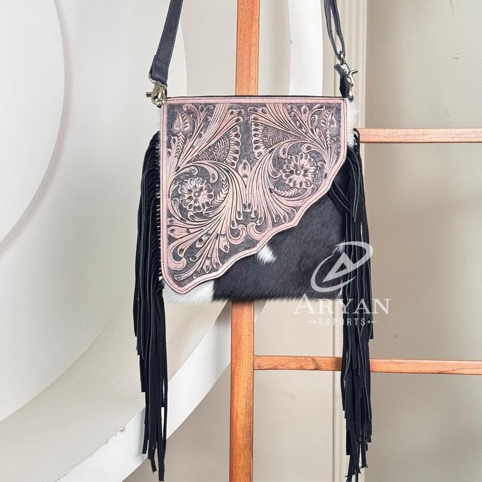 Product name:Hand Tooled Cowhide Leather Fringe Crossbody Bag
