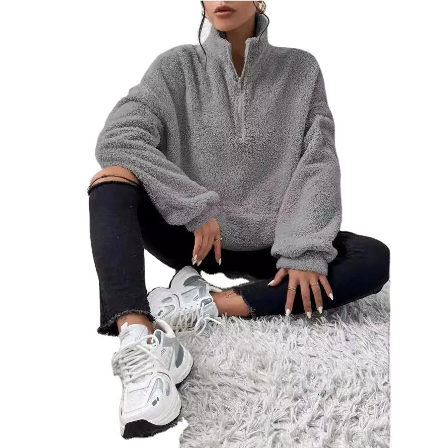 2025 New Casual Half Zip Women Pullover Solid Color Plush Oversized Hoodie with Embroidered Stand Collar Long Sleeve Terry Tops