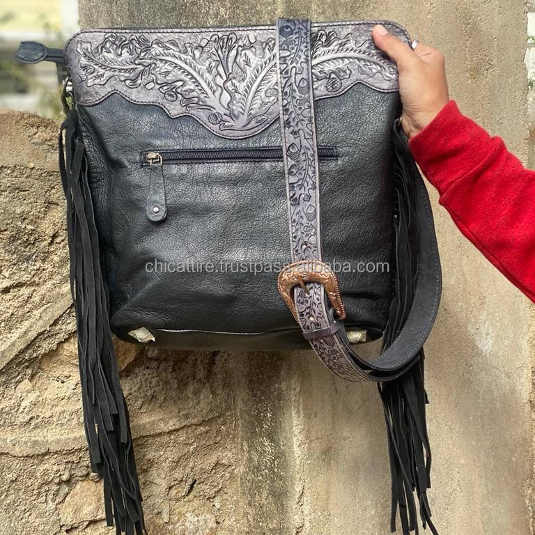 2025 New Design Hand Tooled Genuine Leather Handbag Real Cowhide Fringe Sling Bag Carving Bohemian Floral Sling Bags for Women's