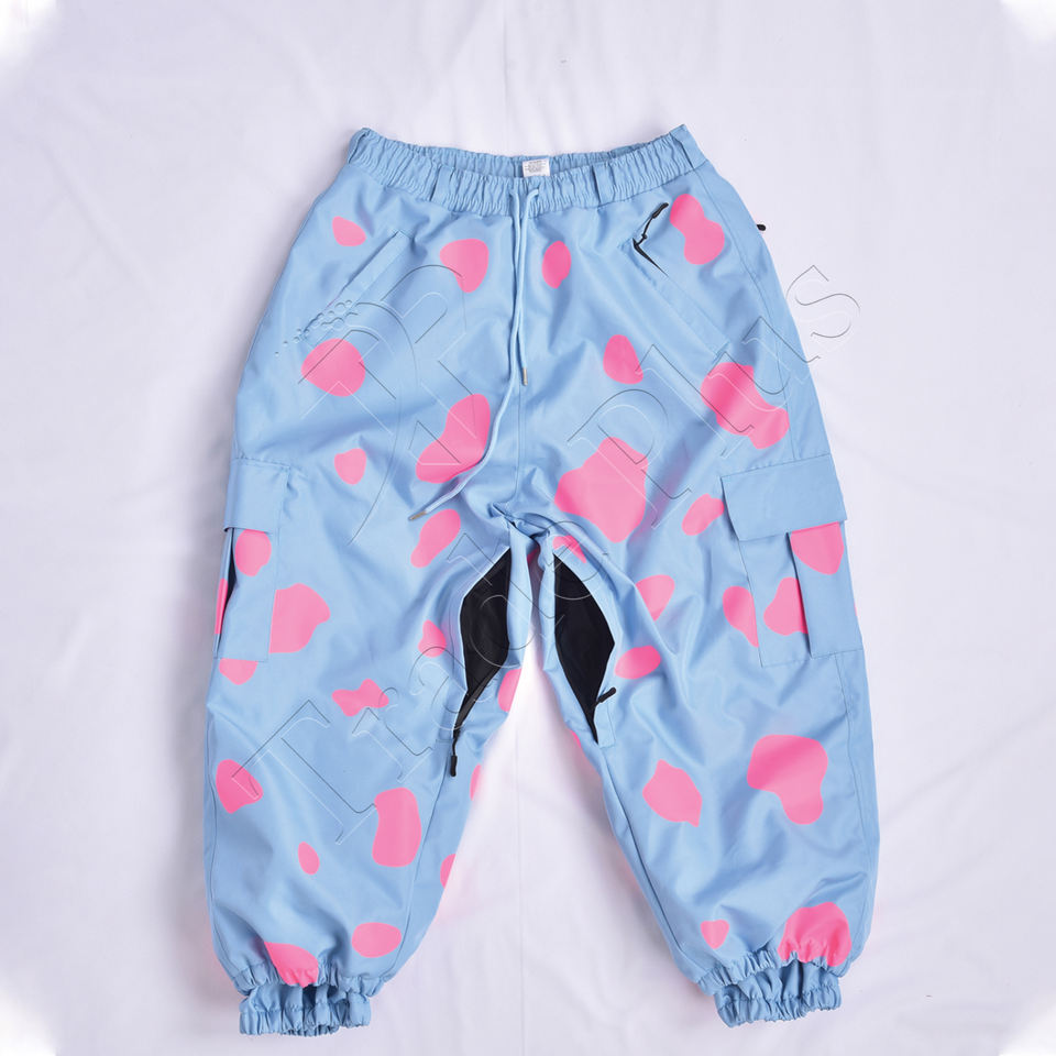 2025 New Design Sky Blue Waterproof Windproof Snow Pants With Allover Pink Vinyl Print Warm Lining Elastic Waist And Air Vents