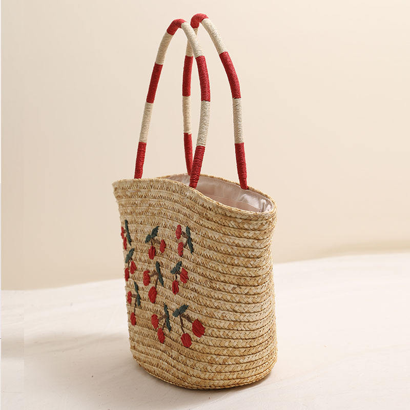 2025 New Embroidered Cherry Shoulder Straw Bag Fashionable Large Capacity Zipper Bag Vacation Beach Handbag