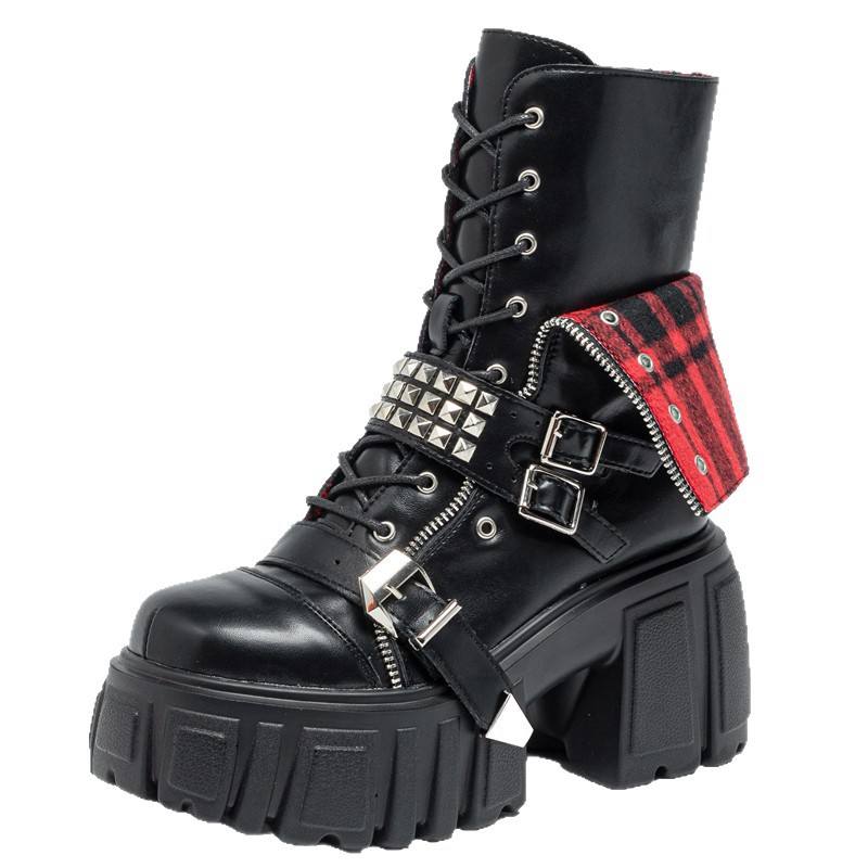 2025 New European American Style Chunky Heel Elevator Ankle Boots for Women Plaid Metal Rivet with Breathable Belt Buckle