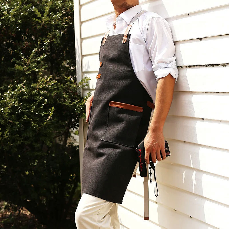 2025 New Factory Heavy Duty Reusable Kitchen Strap Handmade Cotton Canvas Cross Back Leather Apron Work Uniform for Cook