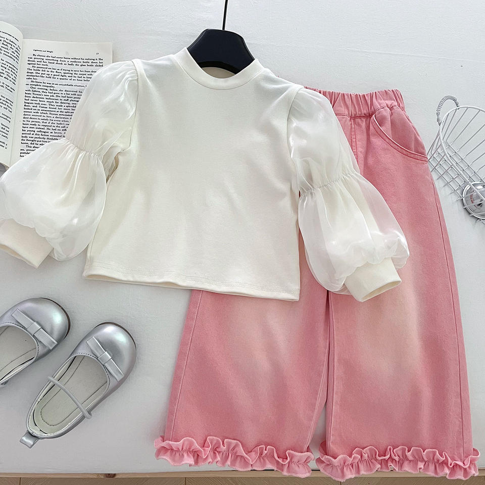 2025 New Fall Teenager Girl 3 Pcs Long Sleeved Clothes Set Sweet Girl Beige Shirt + Pink Denim Vest and Pants Garment