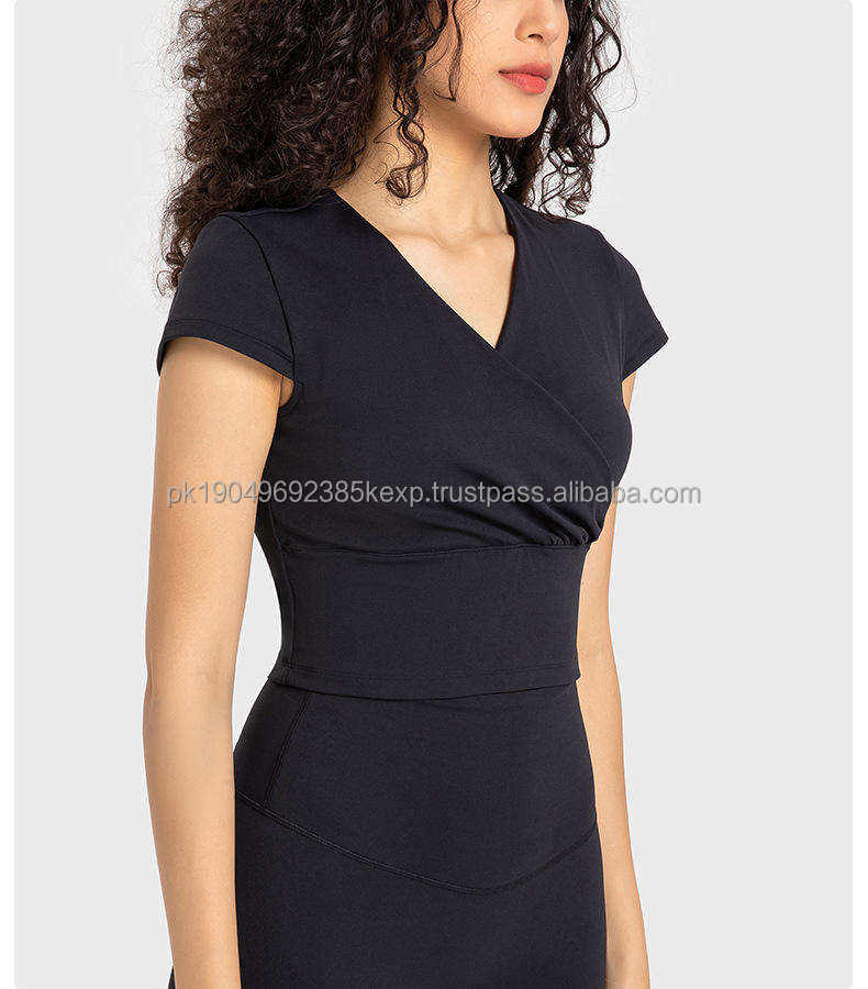 2025 New Fashion Cross V Neck Short Sleeve Crop Top Built in Bra Sports Gym Outdoor Active Wear Sports Yoga T Shirt for Women