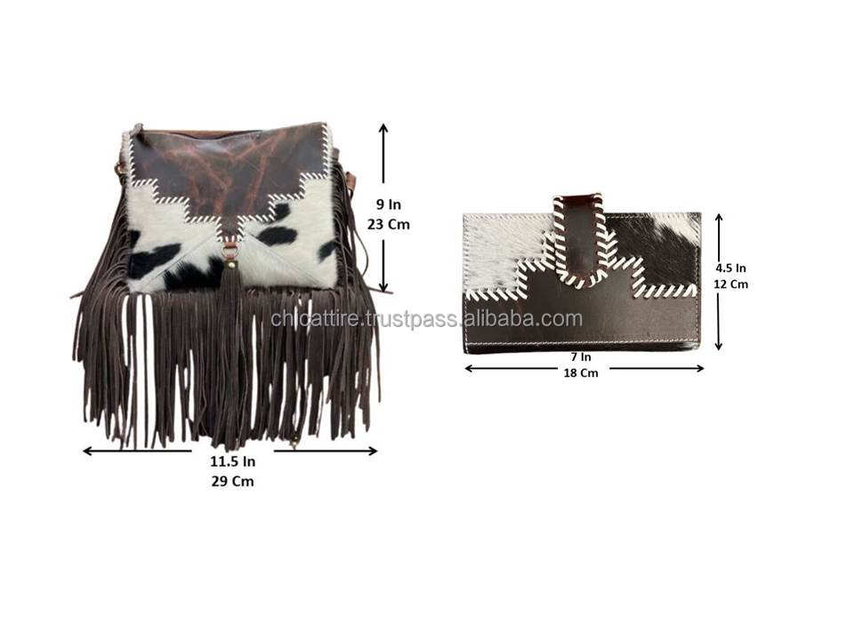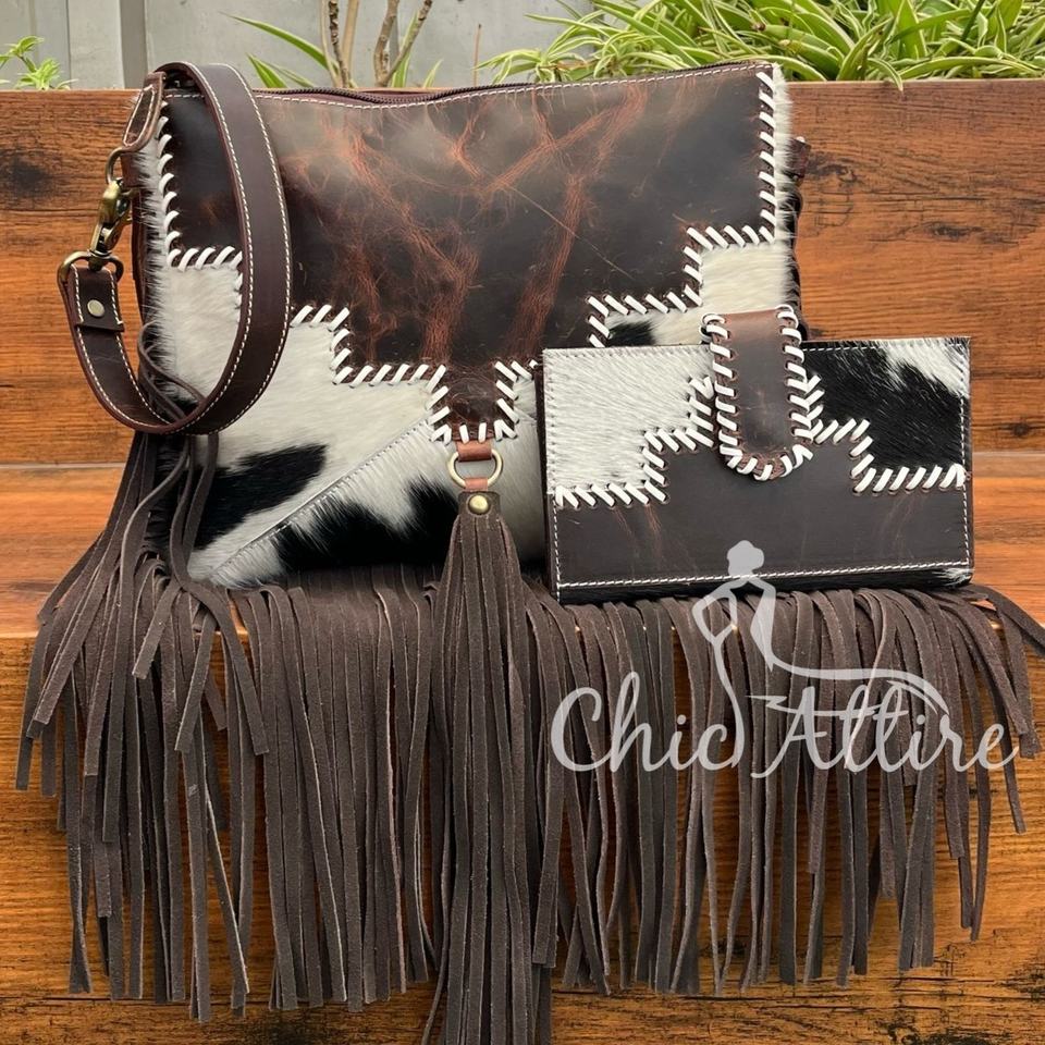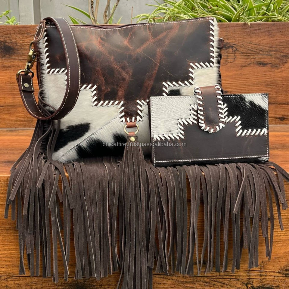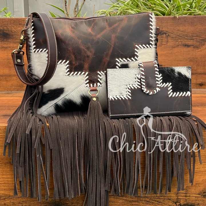 2025 New Fashion Hand-Stitch Leather Cowhide Fringe Crossbody Bags & Genuine Cowhide Leather Bifold Wallet Set 2 Pcs for Women's