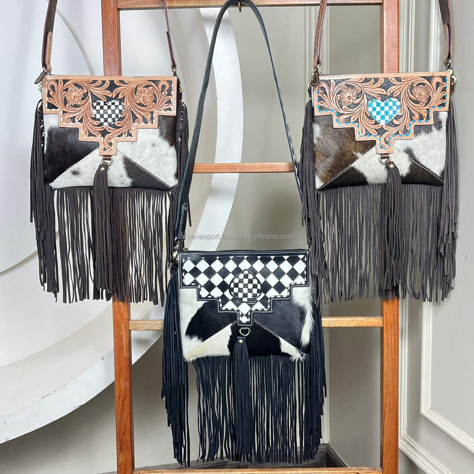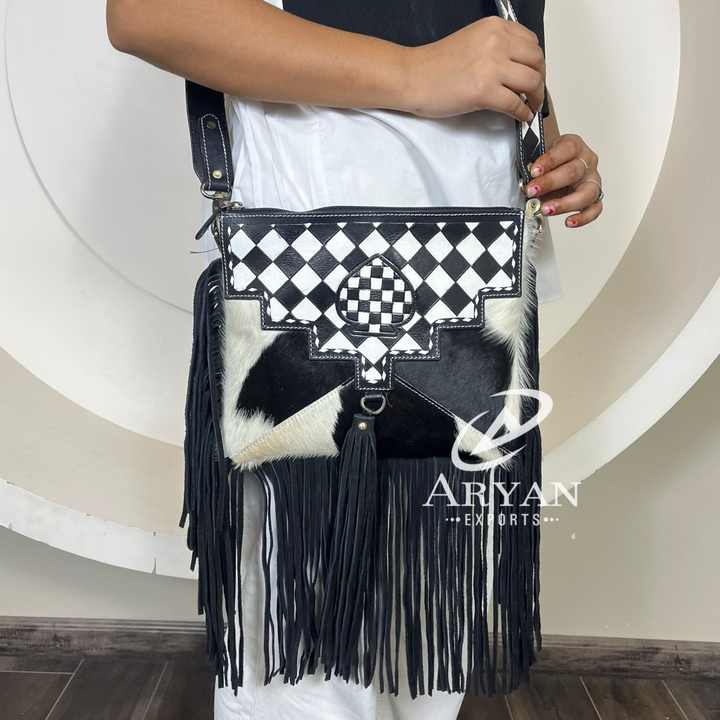 2025 New Fashionable Black & White Checkered Tooled Leather Fringe Crossbody Bag for Women's Genuine Cowhide Shoulder Handbags