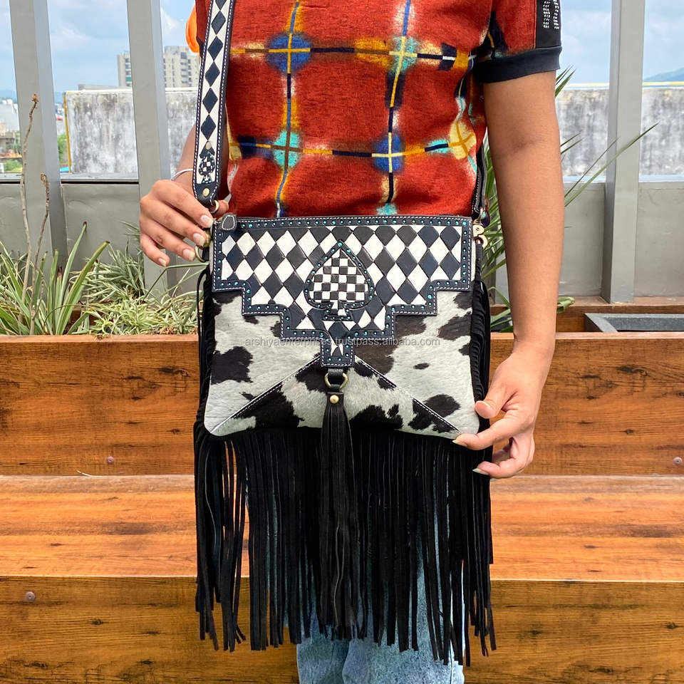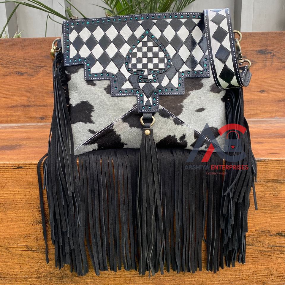 Product name:Hand Tooled Checkered Leather Fringe Crossbody Bag