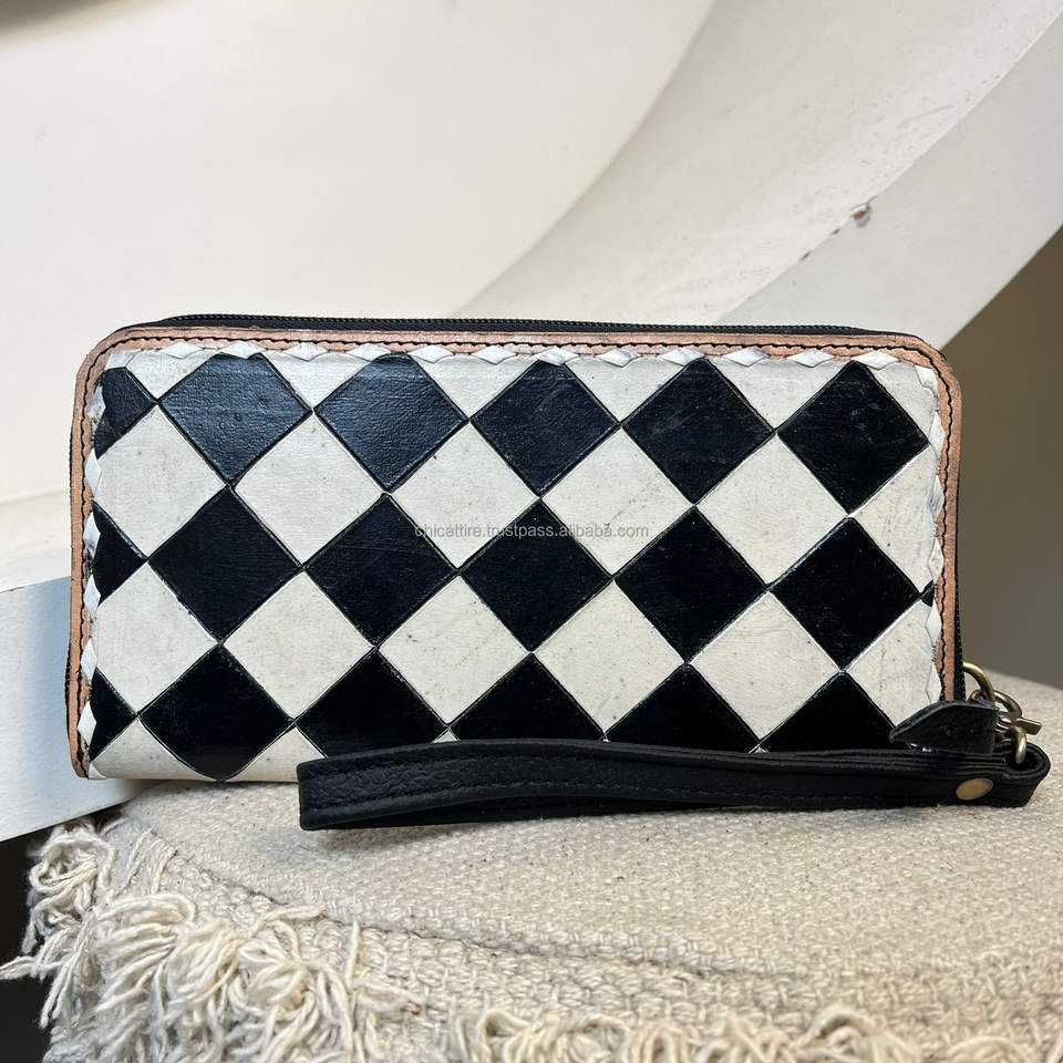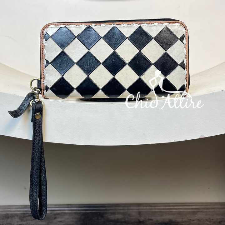 2025 New High Quality Hand Tooled Genuine Leather Black & White Checkered Pattern Wristlet Wallet Card Holder Clutch for Women's