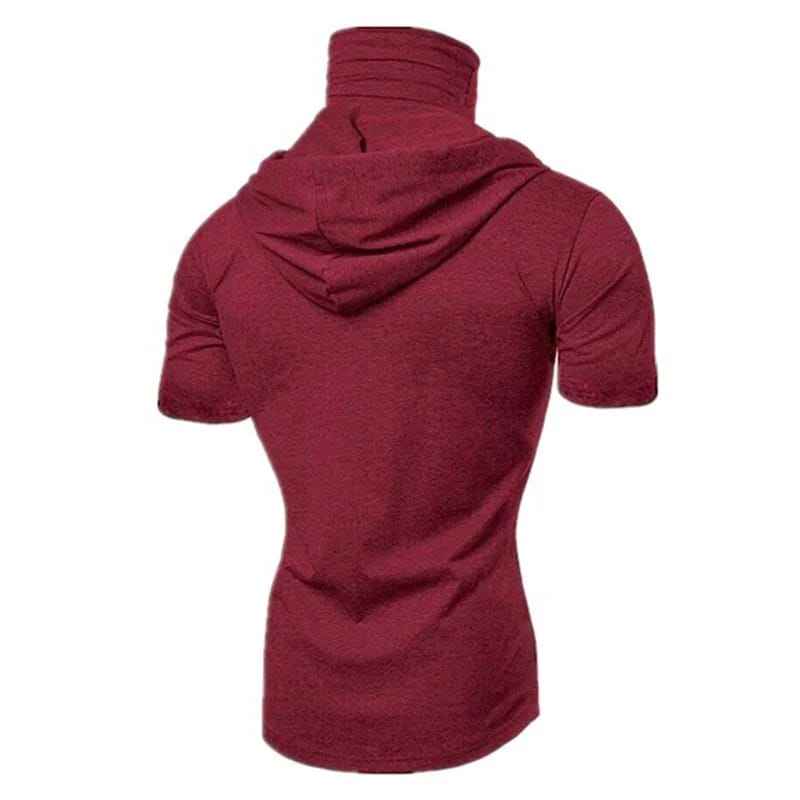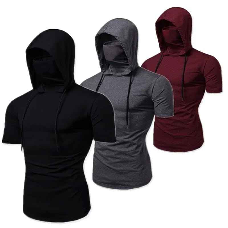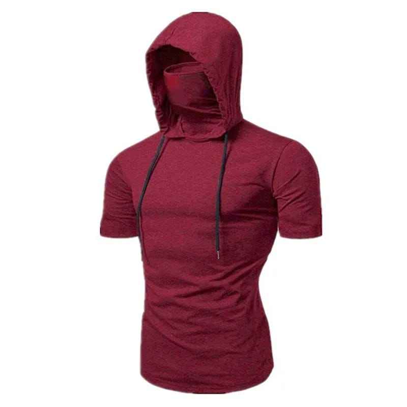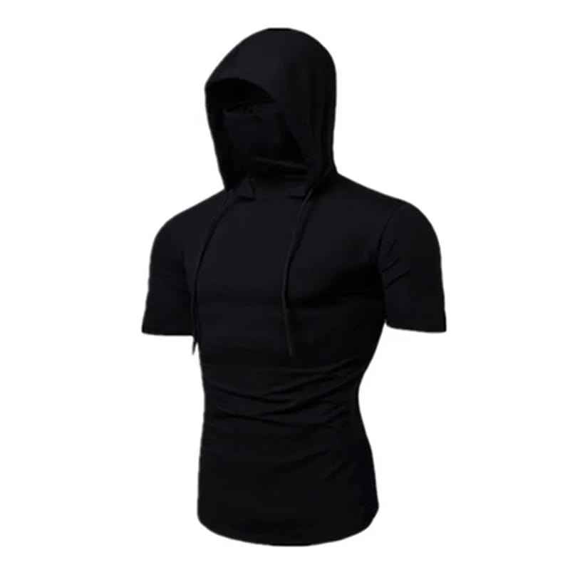 2025 New Men Gym Thin Hoodies Short Sleeve with Mask T Shirt 100% Cotton Solid Casual Spring Embroidered