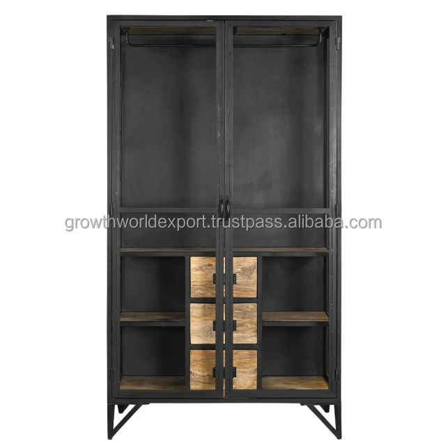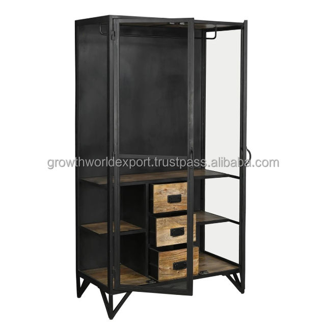 2025 New Modern Industrial Iron Sideboard with 2 Iron Door With 3 Wooden Drawers With High Quality Natural Finished Wood Storage