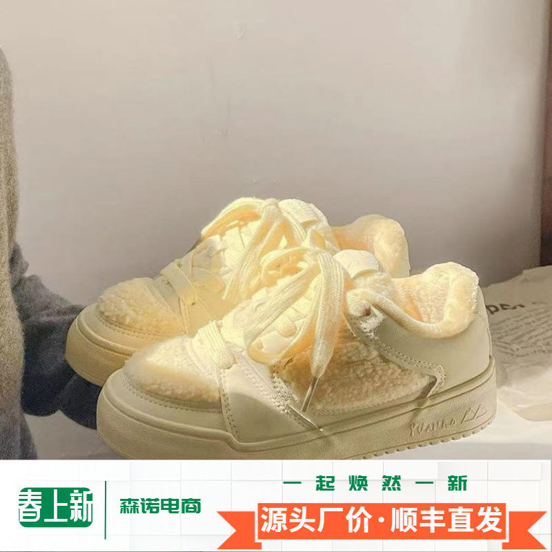 2025 New Style All-Match White Canvas Shoes for Women Spring Plus Velvet Cotton Thick-Soled Furry Style