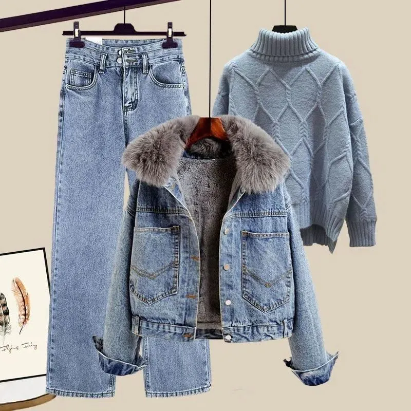 2025 New Style Outfits Plus Velvet Thick Denim Jacket With Slim Jeans Sweater Pullover Three-Piece Suit For Women