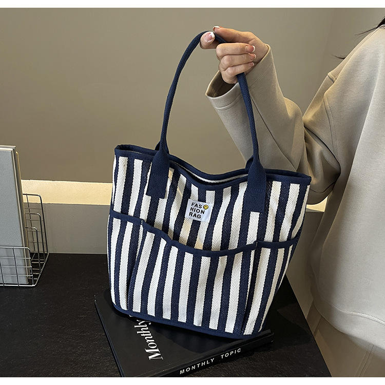 2025 New Style Striped Large-Capacity Canvas Tote Bag for Women Fashionable Trendy Commuter Shoulder Bag for Summer