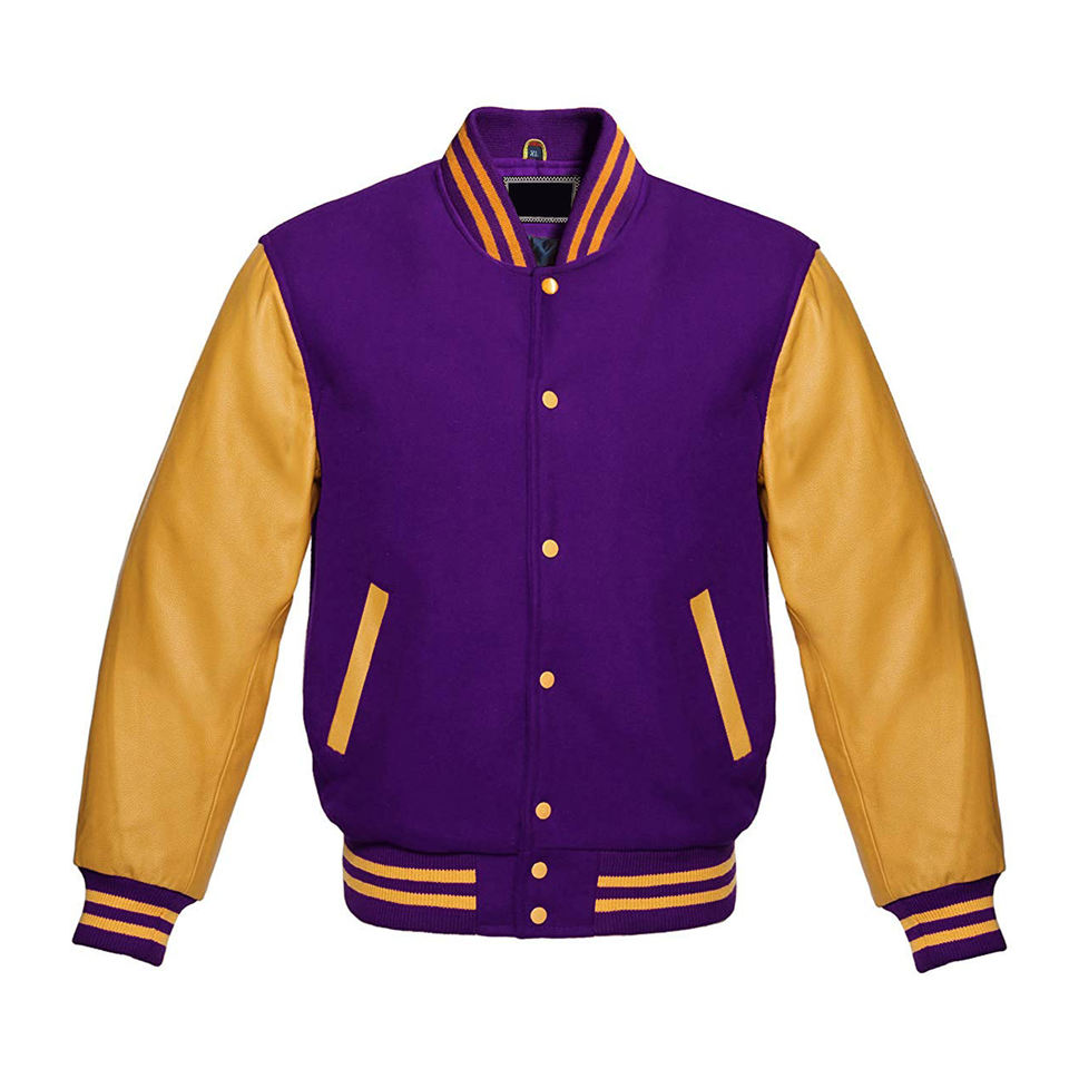 2025 New Unisex Spring Varsity Jacket 100% Cotton Breathable Custom Collar Printed Design Purple Golden Color High Street Front