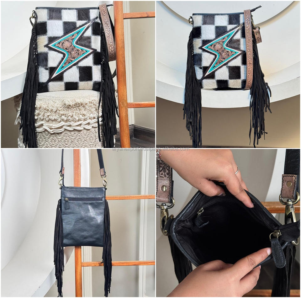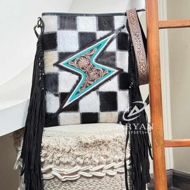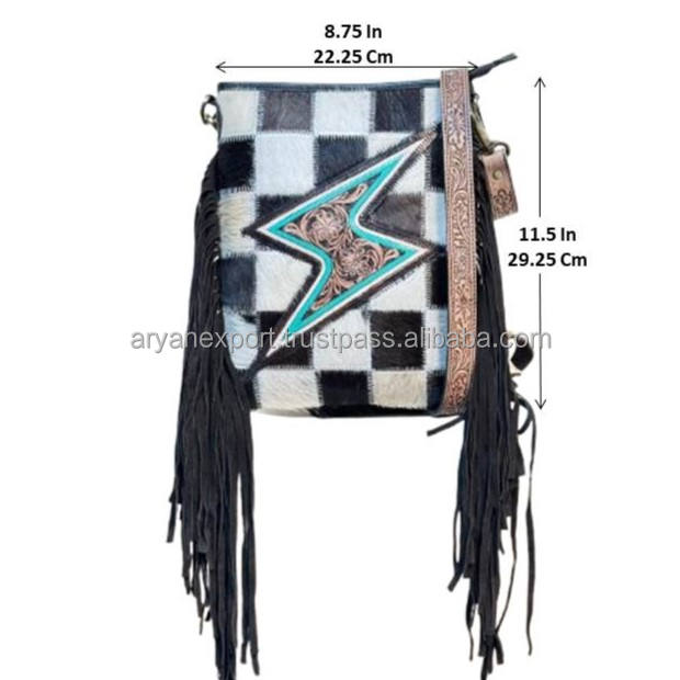 Product name:Hand Tooled Cowhide Crossbody Fringe Bag