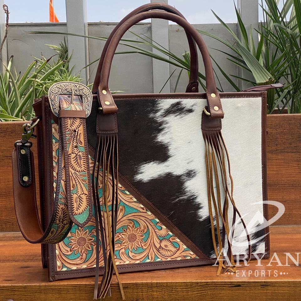 Hand Tooled Genuine Leather Tassel Tote Bag