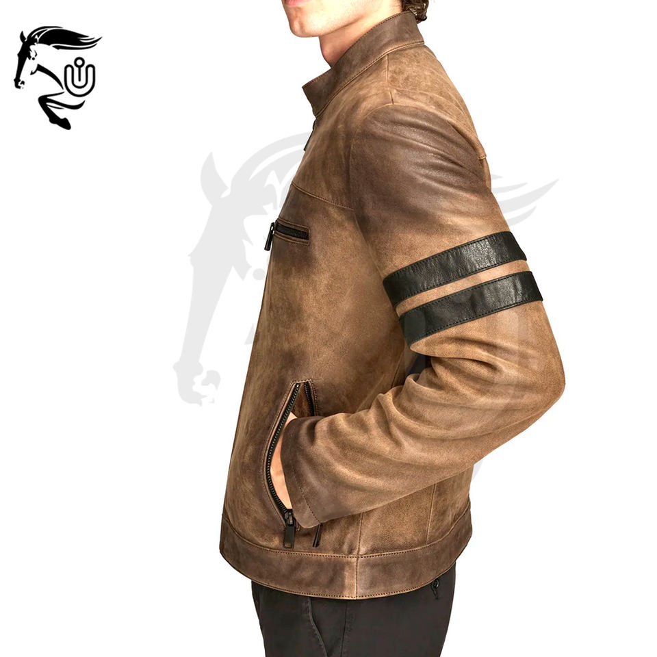2025 New Winter Vintage Brown Cow Skin Leather Jacket Classic Biker Style Distressed Striped Sleeves Custom Logo OEM/ODM